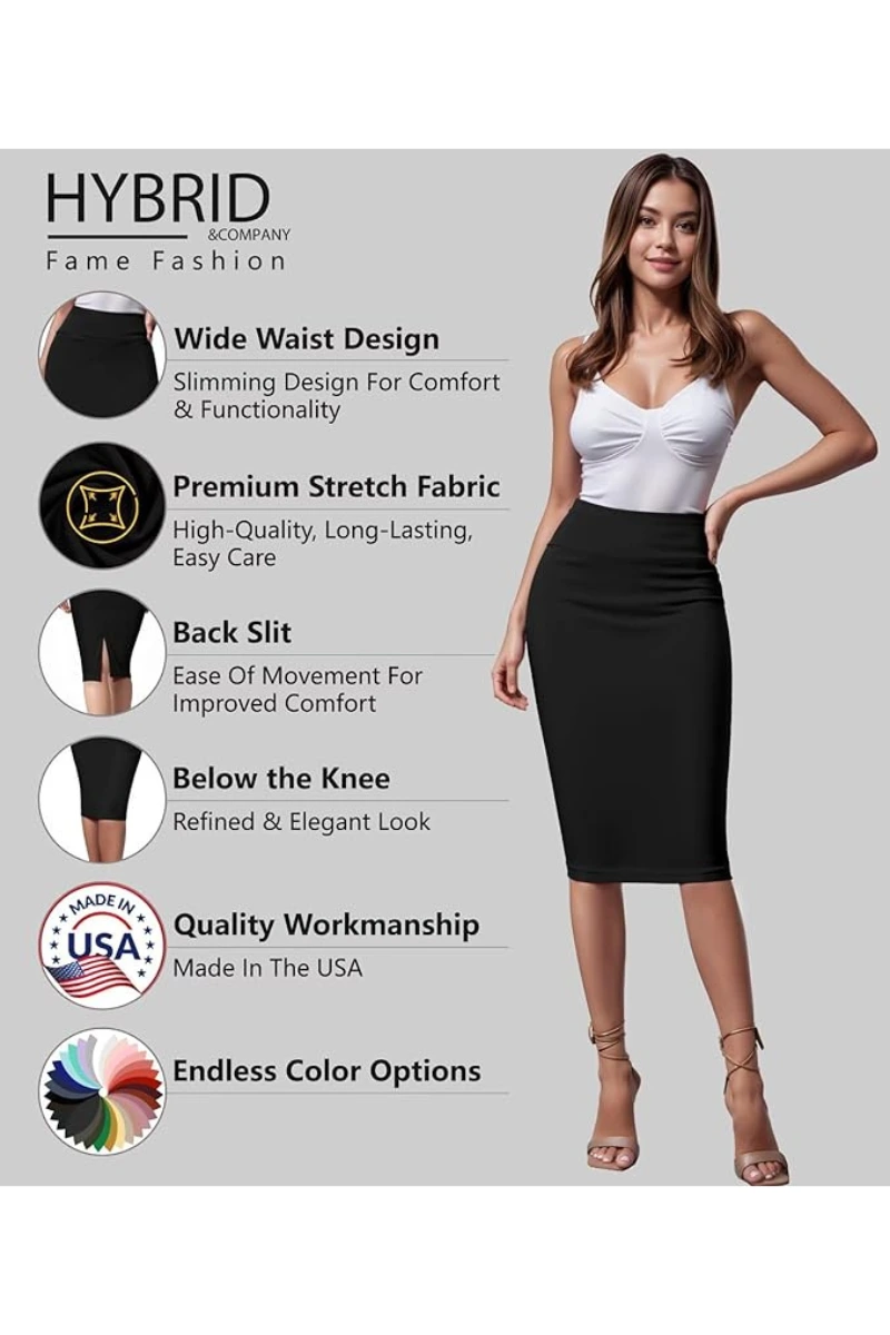The Hybrid & Company Premium Stretch Pencil Skirt is a timeless staple reimagined for modern movement. Crafted from a soft yet structured ponte blend, it offers a flattering slim fit with a high waist that smooths and supports. The midi length and subtle fishtail hem add elegance, while the pull-on design keeps things effortless. Whether paired with a cropped blazer or a soft knit pullover, this skirt transitions seamlessly from desk to dinner — always with grace.